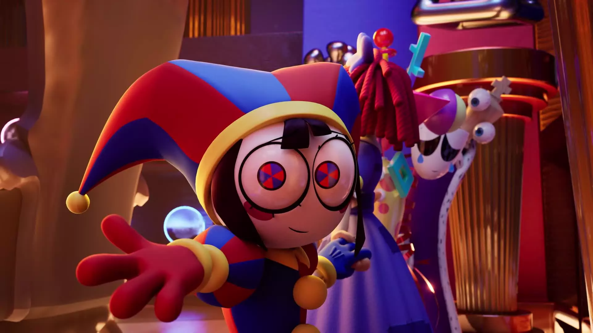 Pomni’s look is instantly readable: small body, oversized eyes, and a jester palette that turns anxiety into silhouette.